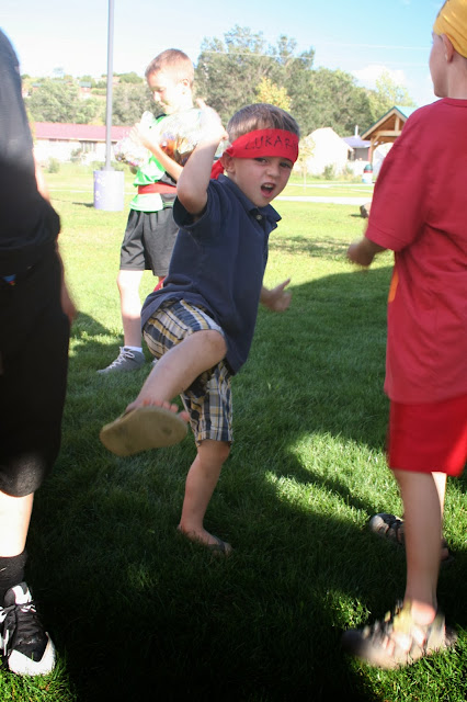 We started the party with the kids all getting a ninja headband (I tore some pieces of red fabric in lengths for all the guests, and Ben's golden ninja headband I made ahead of time).  We looked up their ninja names (see this pin here) and wrote them on the headbands.  Then they were all set for ninja training!  Ben played "Sensei Says" - he was the leader and taught them all his very awesomest ninja moves.  They also played "Follow the Sensei" and "Sensei May I."  (self explanatory, right?)